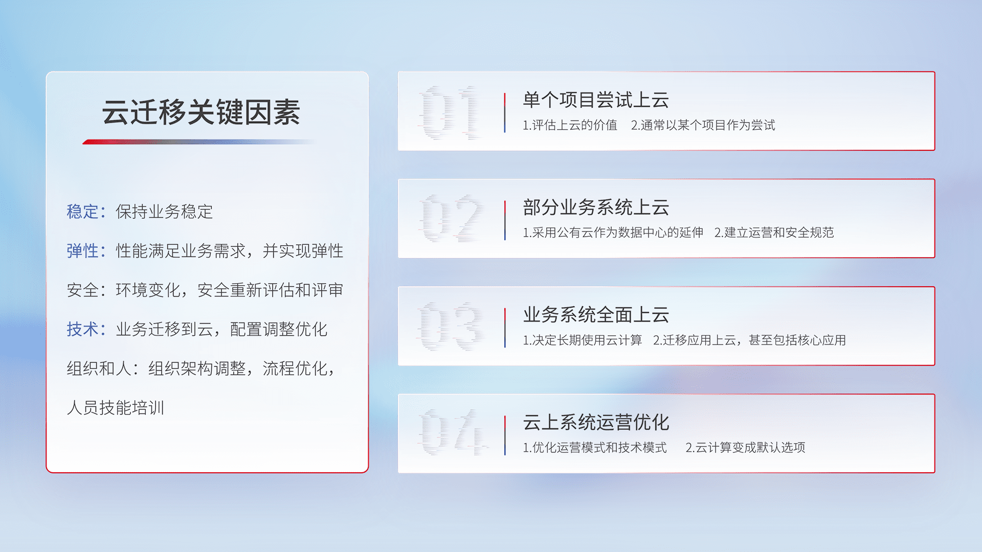 结合实际业务,,,从规划设计、、云平台选型、、、云原生改造、、、、数据迁移、、、、集成交付,,,迁移全过程为客户识别最佳上云路径,,做好风险识别管理,,,,设计网络架构、、、、身份权限、、、、安全审计合规、、、操作审计、、、、日志审计、、、、监控告警策略、、多站点容灾设计等,,,,对云上基础设施进行整体规划,,提升IT治理水平,,以满足弹性、、、、高可用、、、、高性能的需求。。。。