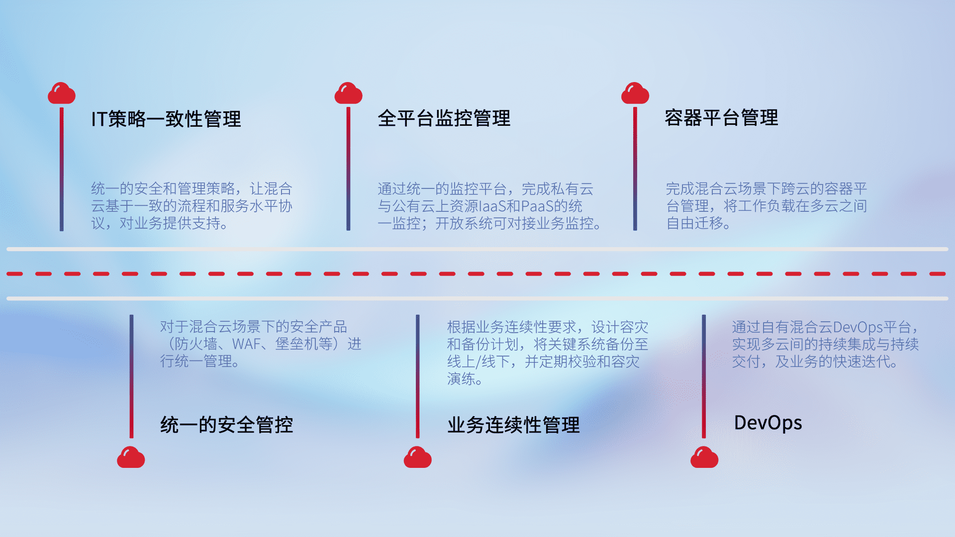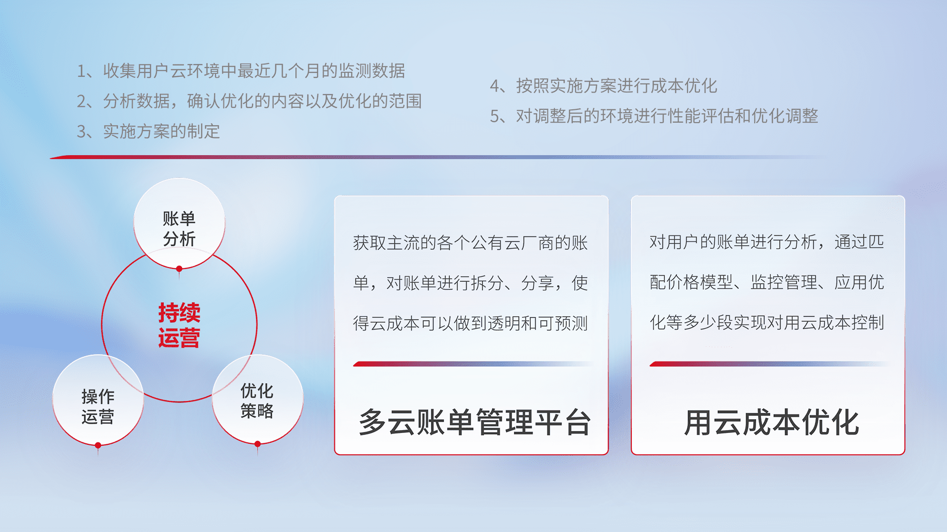 通过多云纳管,,,,以统一的资源数据模型把客户的云资源进行抽象和封装,,,,进而实现对多云资源的统一操作,,,,保障云资源管理的可靠性、、、、稳定性与可用性。。。。量身定制化运维内容,,配置、、、开发运维、、、、补丁管理、、、、备份、、监控、、、认证和访问管理、、审计和日常巡检等,,保障在用云过程中的可靠度,,稳定度以及高可用率。。。。